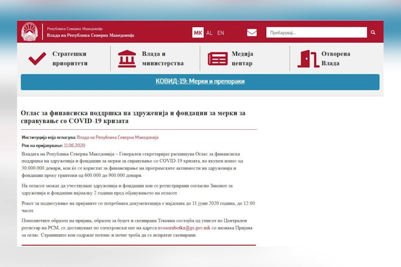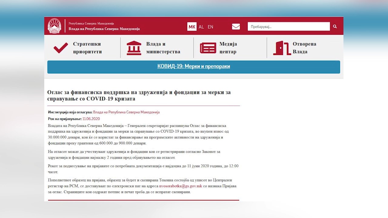 И невладините организаци се вклучуваат со мерки за справување со корона-кризата. Ќе ги финансира Владата со фонд од 5 милиони евра. Една невладина може да добие меѓу 10 и 15 илјади евра. Во огласот се наведени дваесет критериуми за проекти кои треба да се сработат.