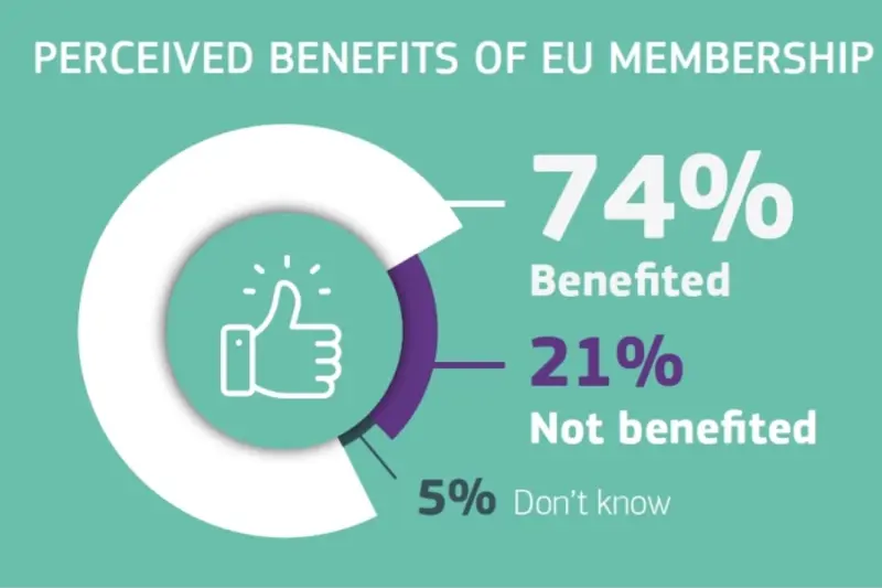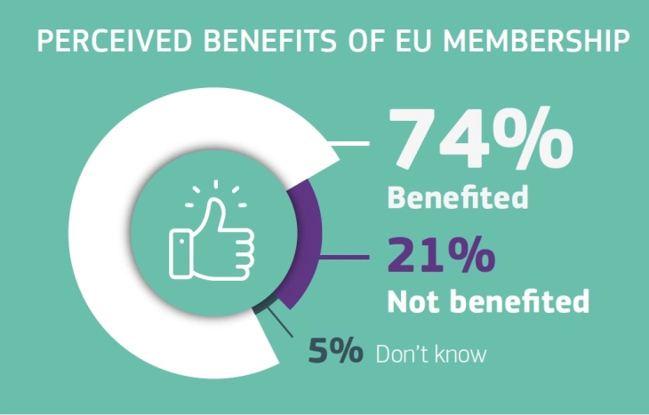 Според овие резултати, 74 проценти од Европејците изјавиле дека нивната земја имала корист од членството во ЕУ, 21 отсто се на ставот дека немала корист, а пет проценти немаат мислење.
