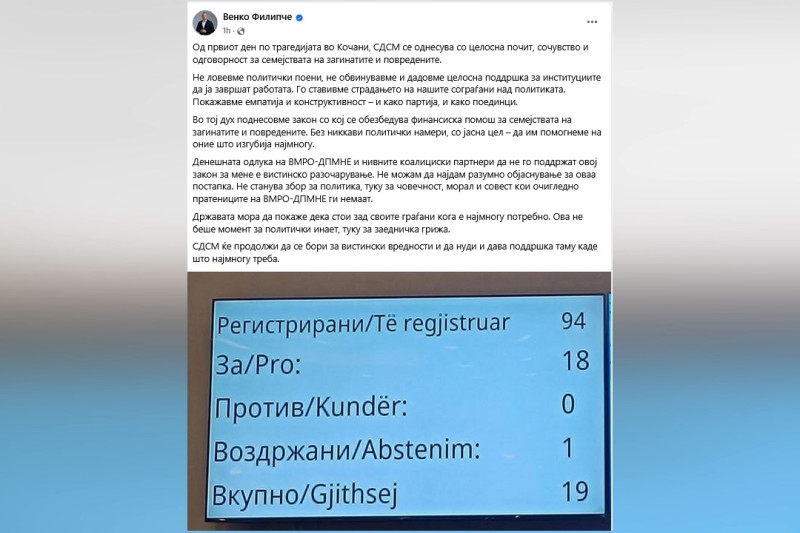 „Од првиот ден по трагедијата во Кочани, СДСМ се однесува со целосна почит, сочувство и одговорност за семејствата на загинатите и повредените. Не ловевме политички поени, не обвинувавме и дадовме целосна поддршка за институциите да ја завршат работата. Го ставивме страдањето на нашите сограѓани над политиката. Покажавме емпатија и конструктивност – и како партија, и како поединци. Во тој дух поднесовме закон со кој се обезбедува финансиска помош за семејствата на загинатите и повредените. Без никакави политички намери, со јасна цел – да им помогнеме на оние што изгубија најмногу. Денешната одлука на ВМРО-ДПМНЕ и нивните коалициски партнери да не го поддржат овој закон за мене е вистинско разочарување. Не можам да најдам разумно објаснување за оваа постапка. Не станува збор за политика, туку за човечност, морал и совест кои очигледно пратениците на ВМРО-ДПМНЕ ги немаат. Државата мора да покаже дека стои зад своите граѓани кога е најмногу потребно. Ова не беше момент за политички инает, туку за заедничка грижа. СДСМ ќе продолжи да се бори за вистински вредности и да нуди и дава поддршка таму каде што најмногу треба“, напиша претседателот на СДСМ, Венко Филипче.