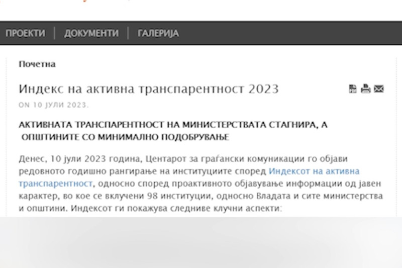 Активната транспарентност на македонските институции за 2023 година бележи скок од 3 % поени кој лани бил 73 % за сега да е 76 покажува истражувањето на центарот за граѓански комуникации кои го спроведуваат секоја година во рамки на проектот „Мониторинг на јавните набавки“.