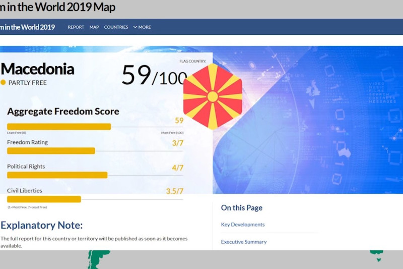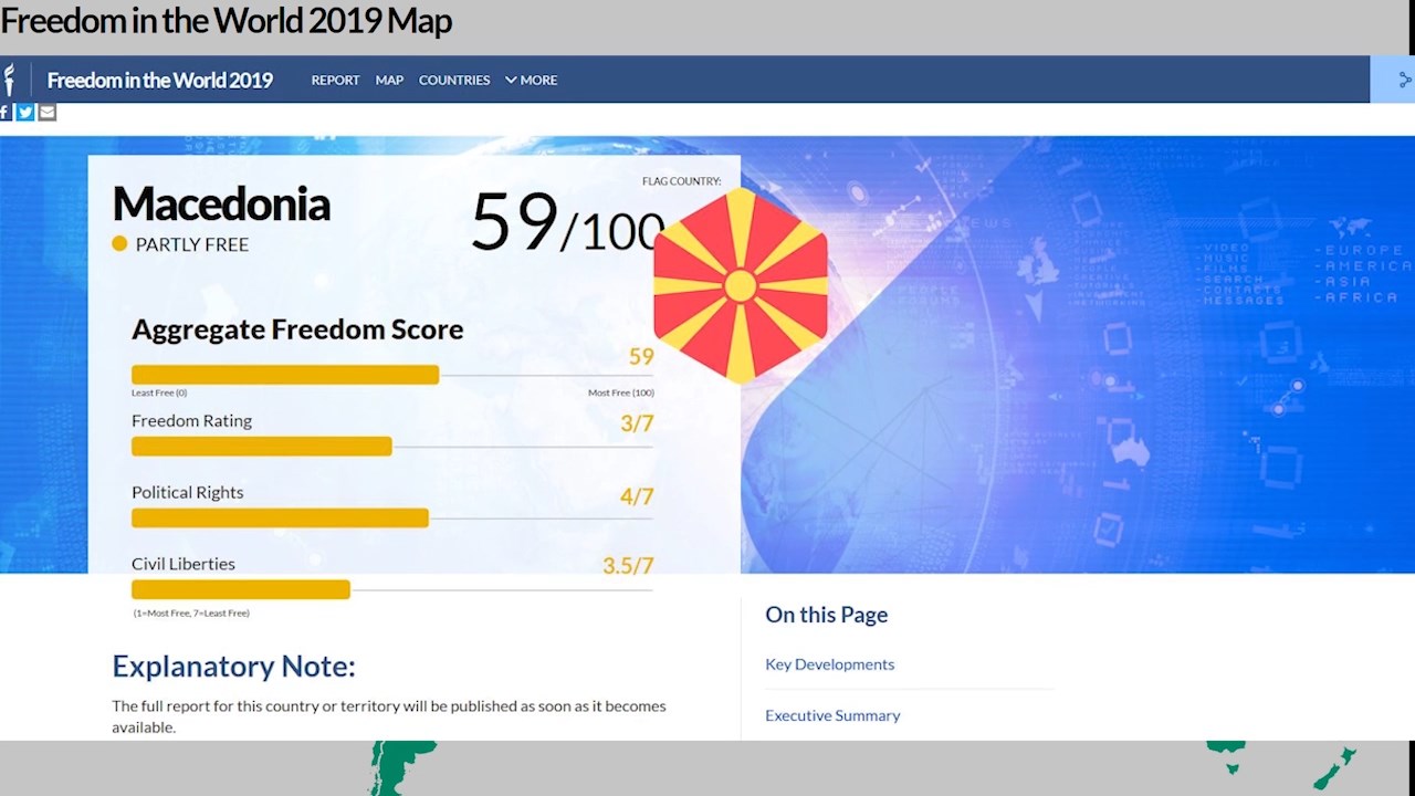 Инаку, во последниот извештај на анализта на американската невладина организација, Македонија е делумно слободна земји која доби оценка 3 од вкупно 7. За политичките права оценета е со 4, а според граѓанските слободи со 3,5. Според „Фридом хаус“, земјава бележи само мал напредок во однос на овие две категории.