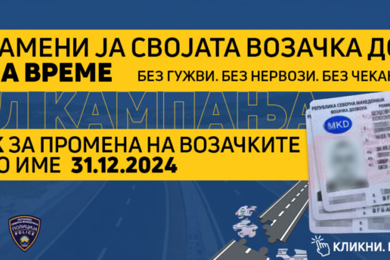 Министерството за внатрешни работи (МВР) денеска во рамки на својата кампања повторно ги повикува граѓаните навреме да ги заменат возачките дозволи со старото уставно име на државата. Согласно измените во Законот за безбедност во сообраќајот, потсетуваат од МВР, нивната важност е до 31 декември.