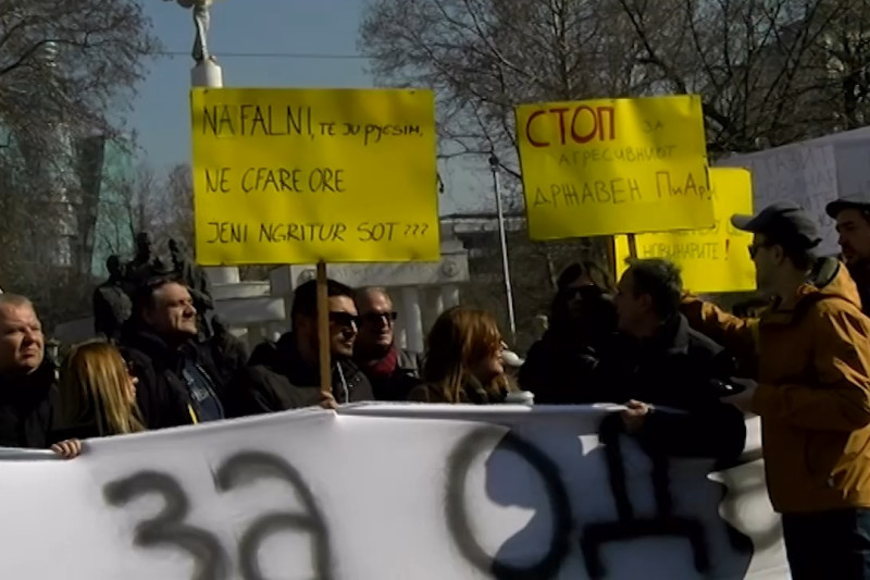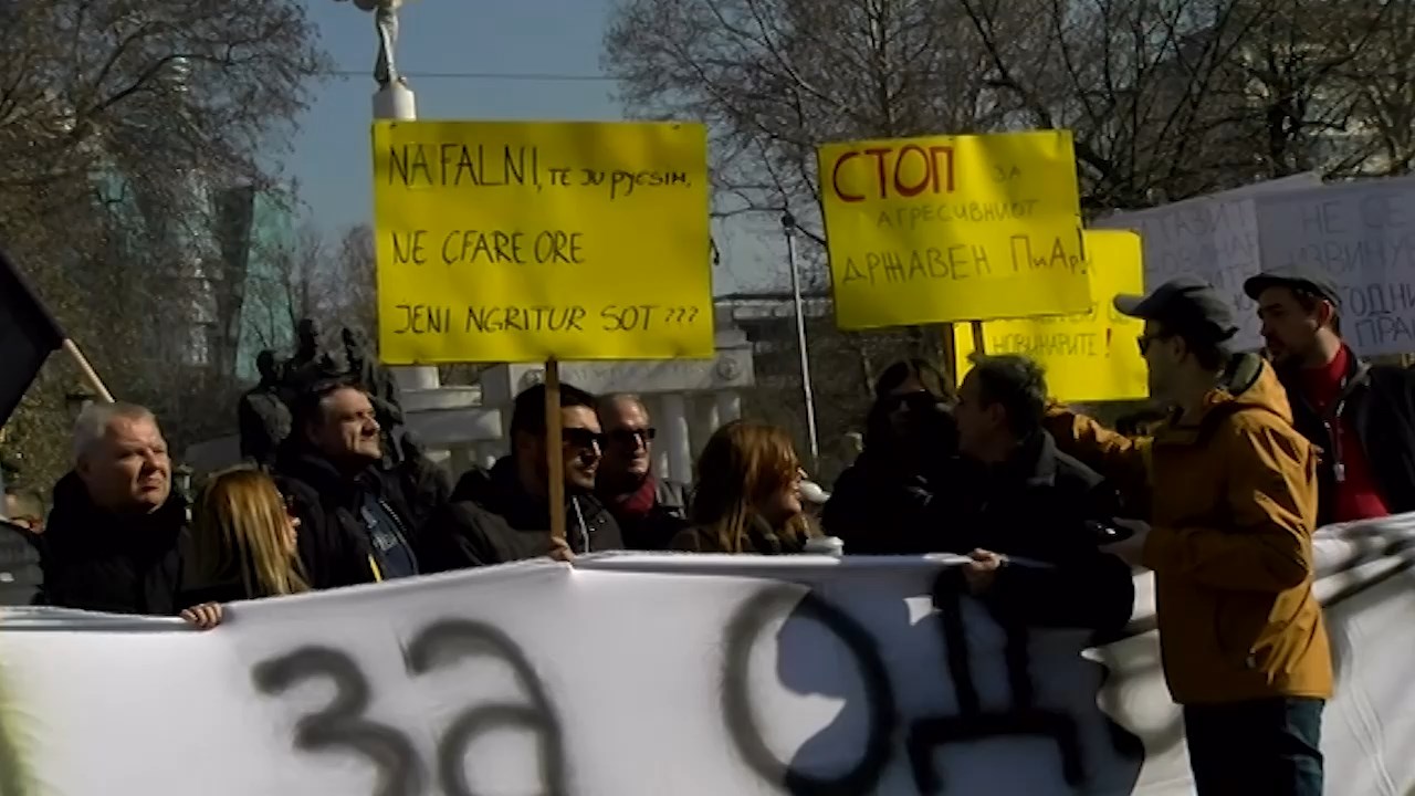 „Доста од преговори“, „Не се извинуваме за незгодните прашања“, „Стоп за агресивниот државен Пи/ар“, - медиумските работници на протестен марш од Влада до Собрание.