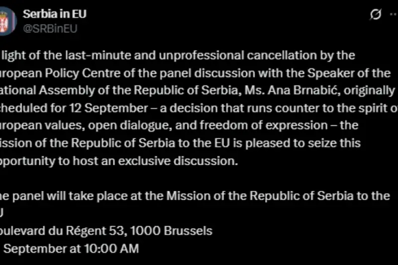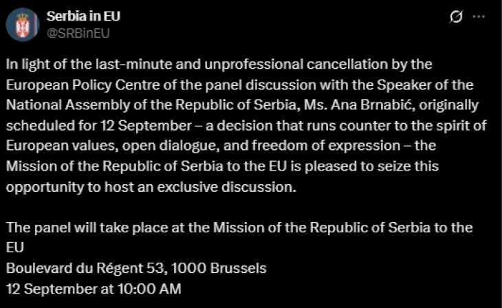 Мисијата на Сарбија на платформата X (@SRBinEU) објави дека „со оглед на непрофесионалното откажување во последен момент на панелот со... Брнабиќ, а од страна на Европскиот политички центар, што беше закажан за 12 септември, што е одлука спротивна на духот на европските вредности, отворениот дијалог и слободата на изразување, Мисијата на Република Србија во ЕУ со задоволство ја користи оваа можност да организира ексклузивна дискусија“.