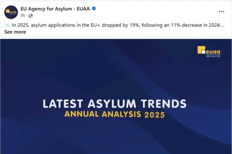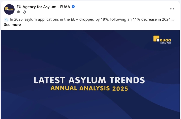 Вкупно околу 822.000 барања биле регистрирани во 27-те земји-членки на ЕУ и двете партнерски земји, што претставува пад од 19 отсто во споредба со 2024 година, се наведува во извештајот на Агенцијата на ЕУ за азил со седиште во Малта.
