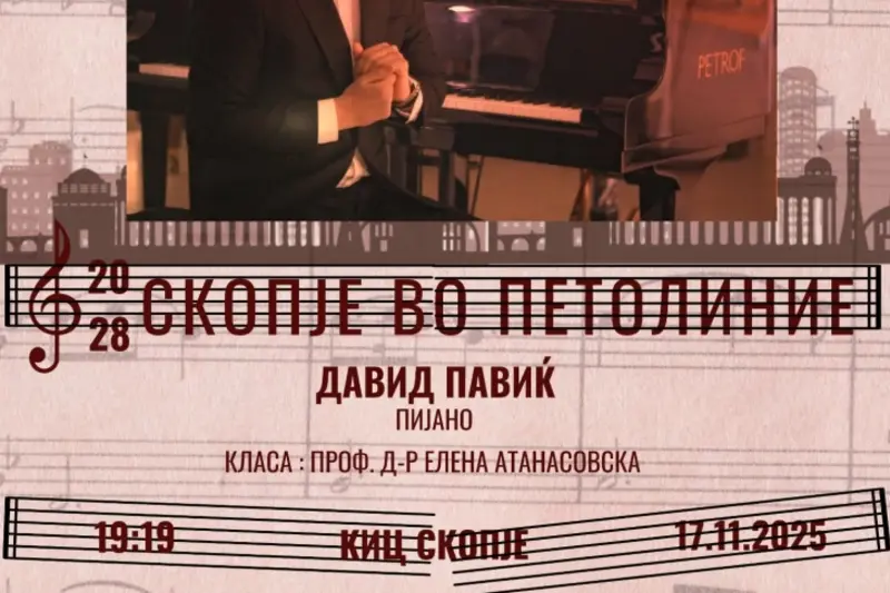- Овој уникатен рецитал ќе ја раскаже музичката приказна на нашиот град преку внимателно одбрани дела на македонски композитори, претворајќи го Скопје во вистинска партитура, а пијаното – во раскажувач. Рециталот претставува интимна пијанистичка нарација која го пренесува духот и енергијата на градот директно до срцето на публиката. На пијаното ќе настапи Давид Павиќ, млад, но веќе признат пијанист кој го претставува новиот бран на македонски уметници, се вели во најавата.