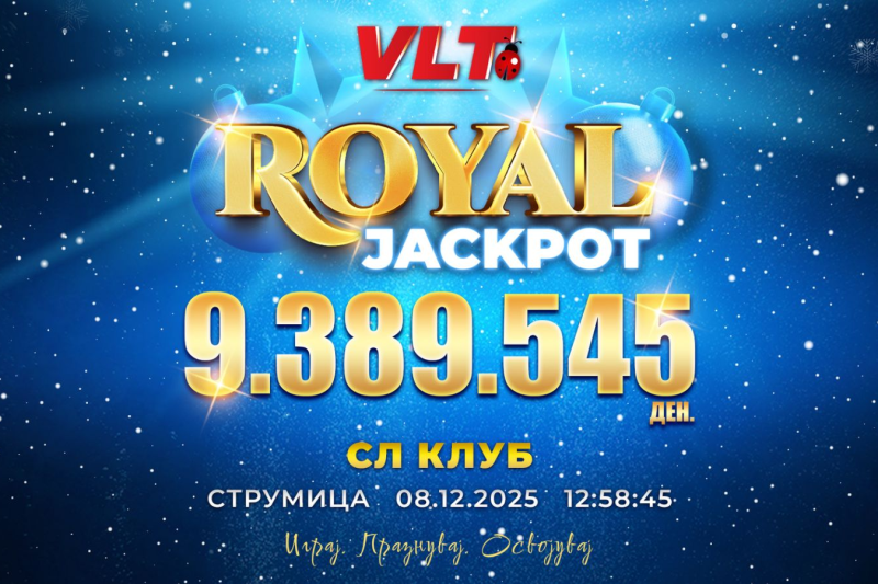РОЈАЛ ЏЕКПОТ добивката вредна фантастични 9.389.545 денари е освоена во Спортлајф Гејминг во Струмица на 08.12.2025. Среќната ВЛТ игра е 40 Брнинг хот.