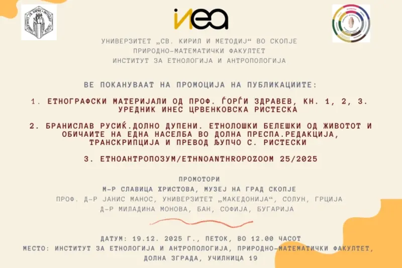 Институтот за етнологија и антропологија при Природно-математичкиот факултет на УКИМ денеска ќе промовира три нови изданија: „Етнографски материјали“ од проф. Ѓорги Здравев во уредништво на проф. Инес Црвенковска Ристеска, „Долно Дупени: етнолошки белешки од животот и обичаите на една населба во Долна Преспа“ од Бранислав Русиќ, во транскрипција и превод од српски на проф. Љупчо Ристески, и 25-тиот број на списанието ЕтноАнтропоЗум.