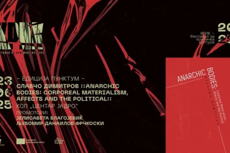 Во Културно социјалниот простор Центар - Јадро вечер ќе се одржи промоција на книгата „Anarchic bodies: Corporeal materialism, affects and the political“ на Славчо Димитров, во рамки на Фестивалот на критичка култура КРИК, кој тематски е насловен како „Преобразби“.