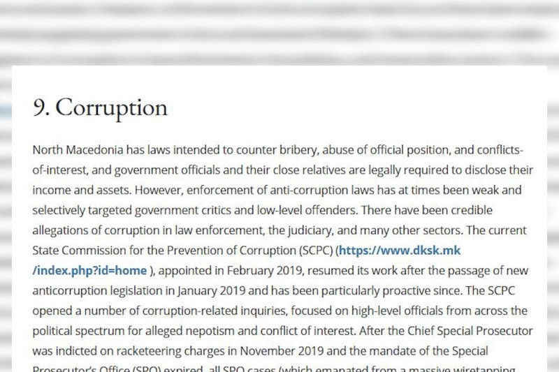 Стејт Департмент нотира селективно таргетирање на критичари на власта и престапници од низок калибар, но и сериозни наводи за корупција во власта и судир на интереси. Се истакнува и фактот дека постојат добри закони, но нивното спроведување е слабо и селективно. Според антикорупционерите, чија работа беше пофалена од официјален Вашингтон, во оваа броба треба да се вклучат сите институции, бидејќи велат сега се оставени сами.