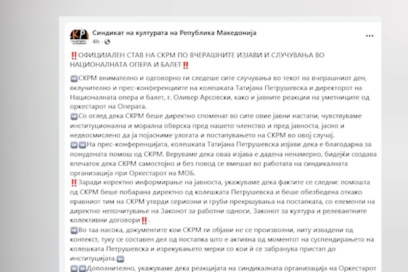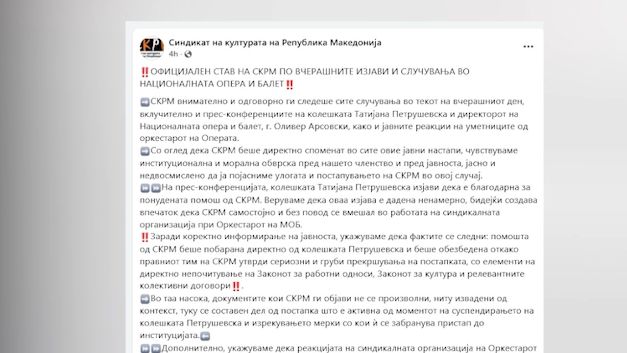 „Имајќи ја предвид надлежноста на Министерството за култура како орган што врши основачки и управен надзор над националните културни институции, СКРМ очекува Министерството внимателно да ги согледа сите аспекти на случајот и во рамки на своите законски овластувања, да обезбеди почитување на законите, колективните договори и уставно загарантираните синдикални права, а не со својата веќе утврдена формална ноншалантност и оддалеченост од суштината на проблемот да остава впечаток дека повредите на законите се третираат како административен детал, а не како прашање на принципи“.