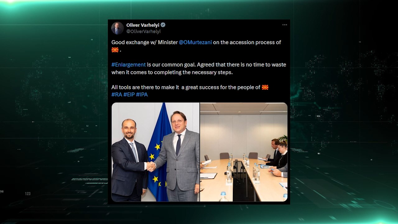 Оливер Вархеји еврокомесар за проширување - Добра размена со министерот Муртезани за пристапниот процес на Северна Македонија. Проширувањето е наша заедничка цел. Се согласивме дека нема време за губење кога станува збор за завршување на потребните чекори. Сите алатки се тука за да се направи голем успех за луѓето од Македонија.