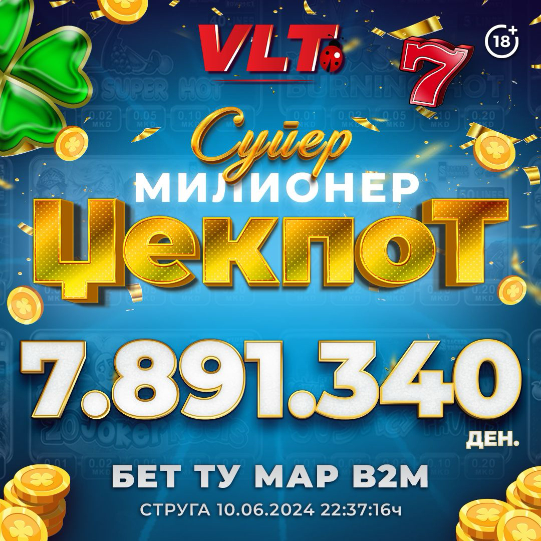 На видеолотариските терминали во Бет Ту Мар во Струга, играч освои фантастични 7.891.340 денари. На нашиот најнов среќен добитник, му ја честитаме добивката СУПЕР МИЛИОНЕР џекпот.