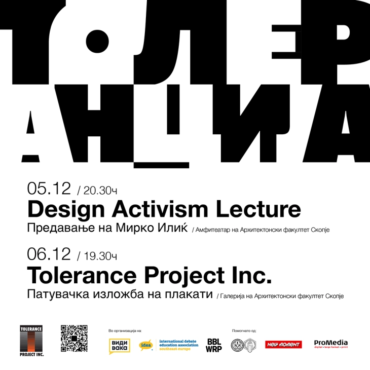 Патувачка изложба „Толеранција“ на светски познатиот дизајнер Мирко Илиќ пристигна во Скопје. Авторот Илиќ вечер во 20:30 часот во просториите на Архитектонски факултет, ќе одржи предавање на тема „Дизајн активизам“, а утре вечер во 19:30 часот во галеријата на Архитектонскиот факултет ќе биде отворена изложбата на постери „Толеранција“.