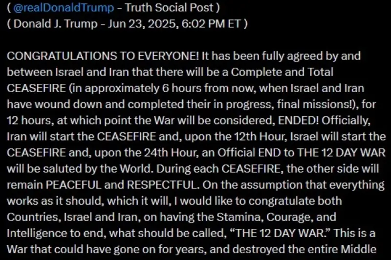 Во објава на „Truth Social“, Трамп рече дека прекинот на огнот ќе стапи на сила приближно шест часа откако Израел и Иран ќе ги „одбијат“ своите последни напади. Трамп им честиташе на сите вклучени во договорот и додаде дека војната наскоро ќе се смета за завршена.