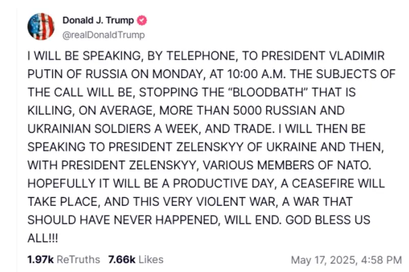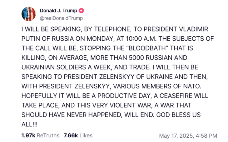 Во понеделник, во 10:00 часот наутро, ќе разговарам телефонски со претседателот Владимир Путин од Русија. Темите на разговорот ќе бидат запирање на „крвопролевањето“ што убива, во просек, повеќе од 5000 руски и украински војници неделно, и трговијата, соопшти американскиот претседател Доналд Трамп.