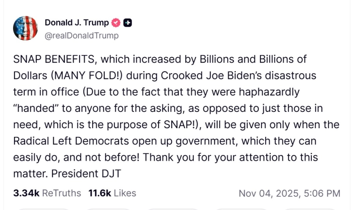 - Помошта од програмата СНАП ќе биде исплатена само кога радикално левичарските демократи ќе ја отворат владата, што лесно можат да го направат. Исплата нема да има пред тоа, објави Трамп на Truth Social.
