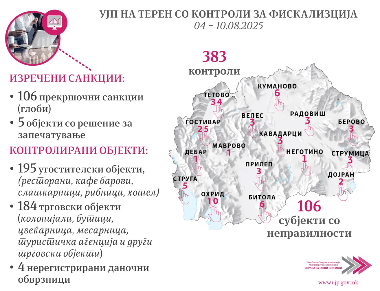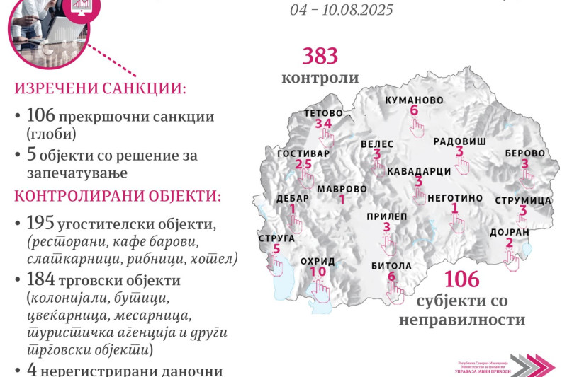 Во периодот од 04.08 до 10.08 2025 година, Управата за јавни приходи (УЈП) спроведе вкупно 383 теренски контроли за фискализација, насочени кон различни типови деловни субјекти, меѓу кои: ресторани, кафе барови, шанкови на плажа, хотели, бутици, колонијали, цвеќарници, месарница, паркинзи и други трговски објекти за продажба на мало.