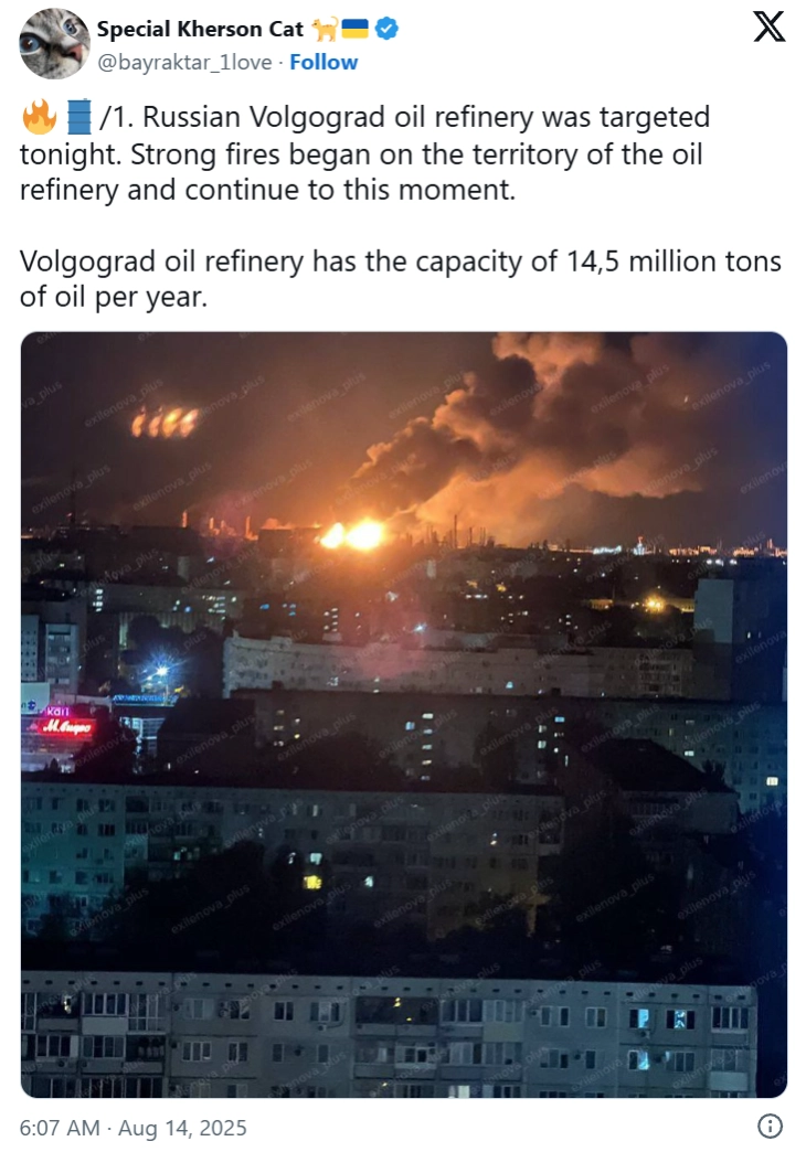 Според медиумските извештаи, три руски рафинерии го намалија или престанаа со работа овој месец поради штетите предизвикани од нападите со украински дронови. Блумберг објави дека објектот на Роснефт во Саратовската област престанал да прима нафта по нападот на 10 август.