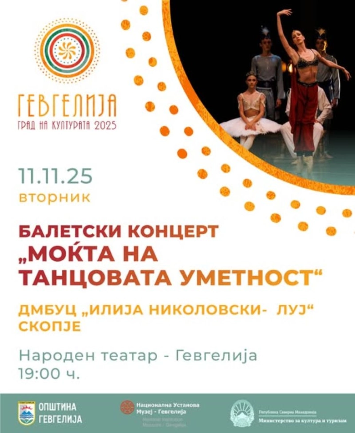 Во рамки на ноемвриската програма на манифестацијата „Гевгелија град на културата за 2025 година“, љубителите на танцовата уметност вечер ќе имаат можност да уживаат во Балетскиот концерт „Моќта на танцовата уметност“, кој ќе се одржи во Народниот театар- Гевгелија, информираа од Општината.